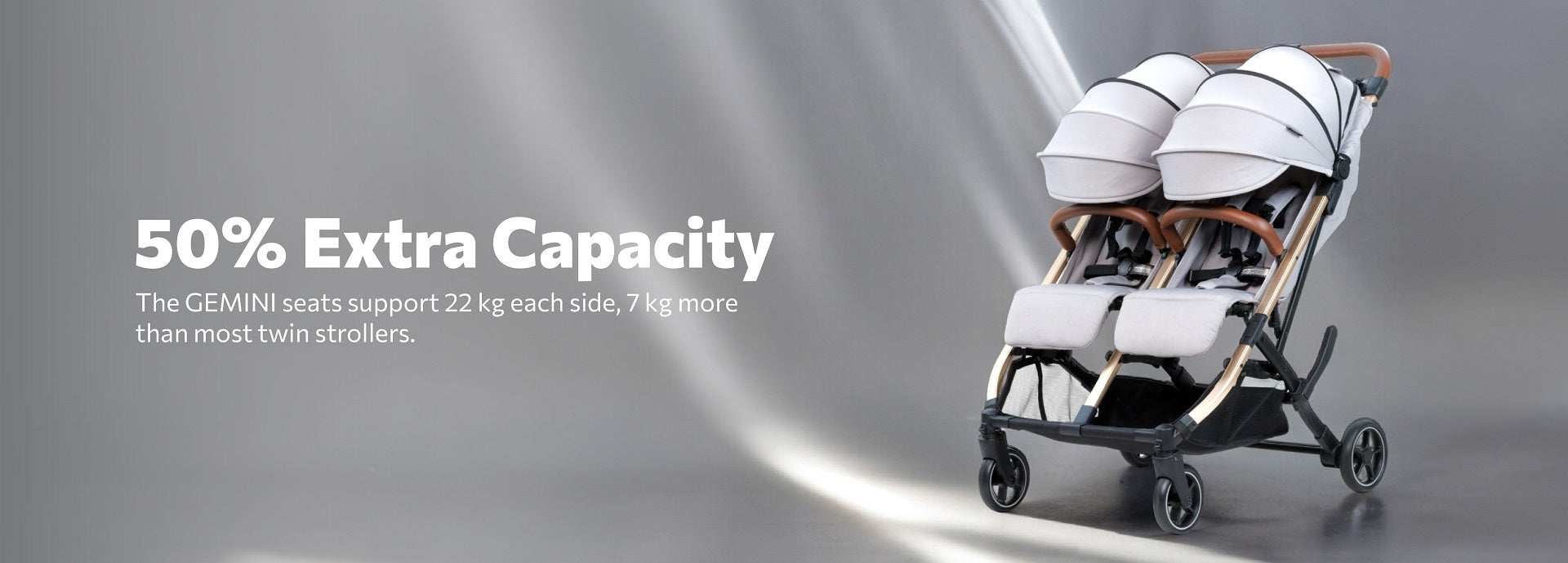 The slimmest folding twin stroller that holds up to 44kg.