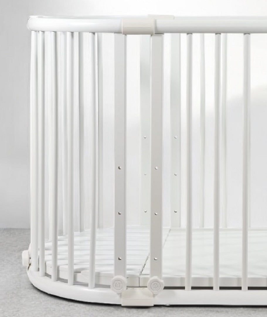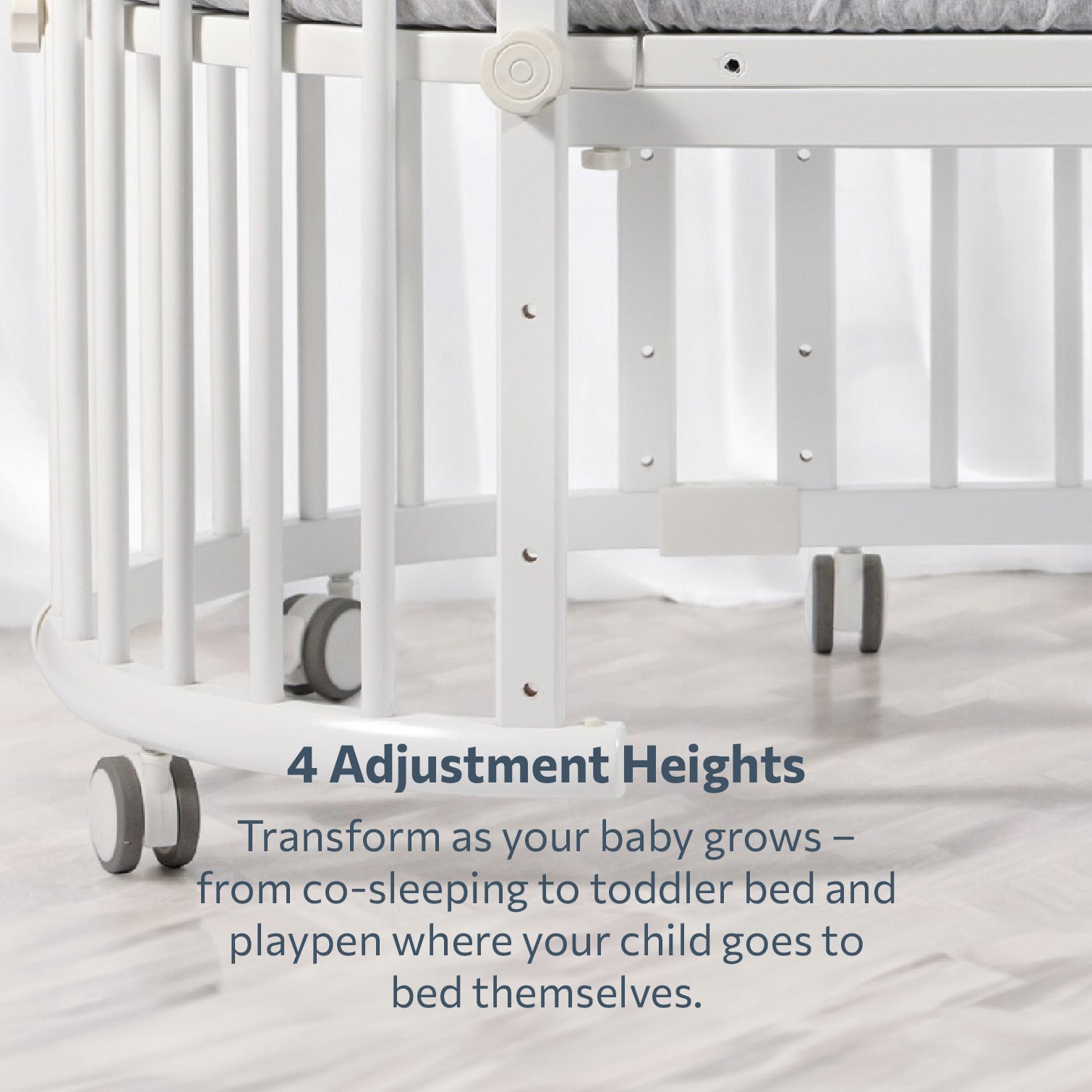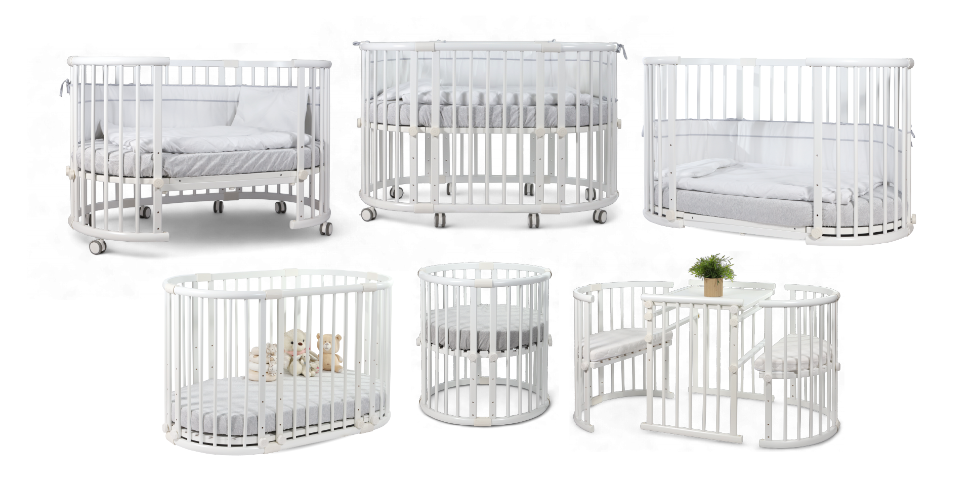 Converts into 8 different modules for usage at different ages, from bassinet, changing table, co-sleeper to baby cot, toddler bed, playpen, chair & table!