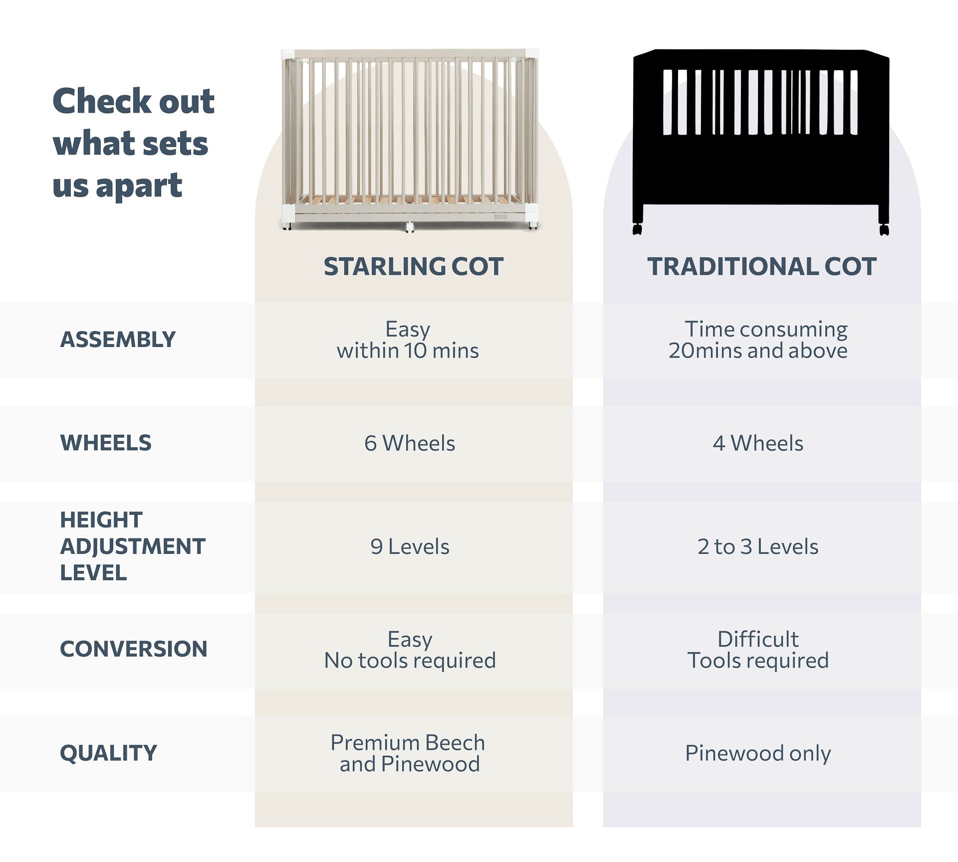 Inspired by the crafty nests of the bird it’s named after! Just like how Starlings create cosy havens for their hatchlings, Beblum Starling Cot provides a safe and snug nest for your little one to grow in comfort.